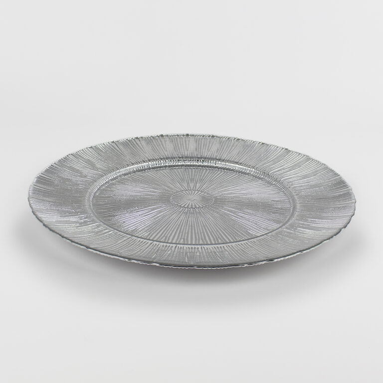 Plato base de vidrio diseñado para realzar mesas en eventos formales. Su cara inferior presenta un elegante patrón radial en relieve, mientras que la superficie superior es lisa, protegiendo la textura y facilitando la limpieza.