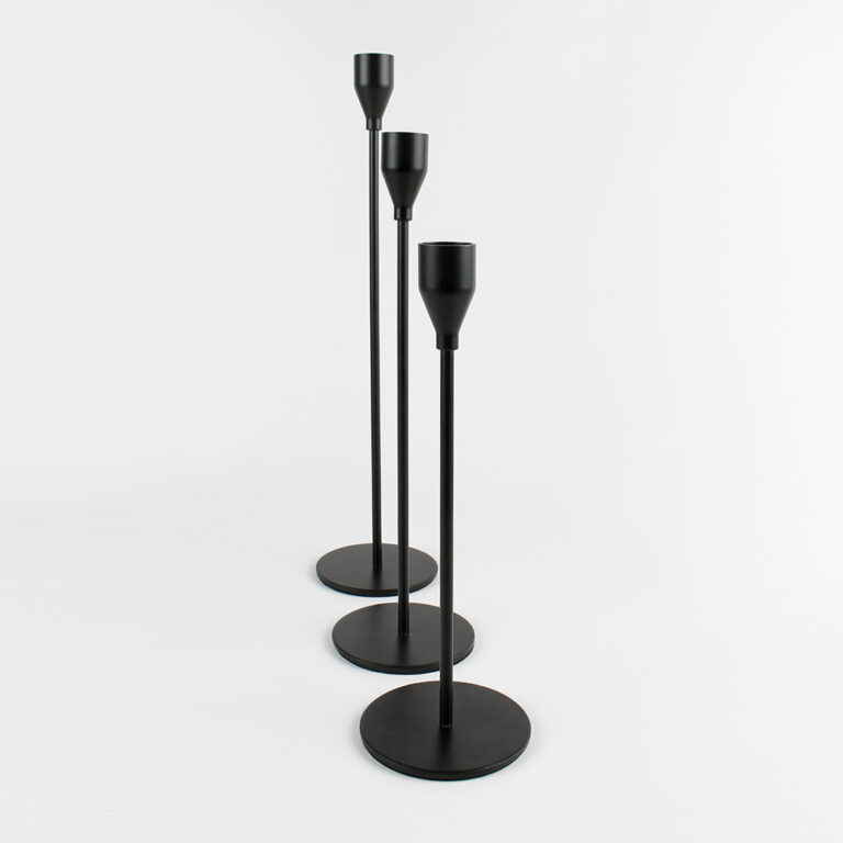 Elegante set de candelabros metálicos con diseño alargado y estilizado, perfectos para mesas. Su base balanceada evita volcaduras, y su acabado resistente garantiza durabilidad frente al uso y la limpieza.